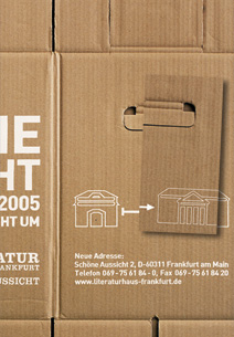 Als Ankündigung zum Umzug des Literaturhaus Frankfurt von der Bockenheimer-Landstraße in die Schöne Aussicht wurden Umzugskartons bedruckt, die in Schaufenstern hingen oder als Kartons in den Räumlichkeiten des Literaturhauses standen. Die EInladungskarten zur Eröffnungsfeier im neuen Literaturhaus waren Ausschnitte aus den Umzugskartonplakaten. Agentur: Standard Rad